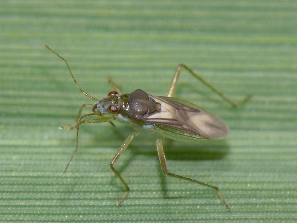 ザ・ミズカメムシの名に恥じず、本科を代表する種として国内各地に普通です。と、色々なところで言われているものの、実は東日本ではかなり珍しいのではないかとか、南西諸島産は本当にこの種なのかとか、地味に闇の残る種です。きわめて広い分布域をもつ種で、九州ではため池や水田など平野部を中心にみられます。写真の個体は暗色ですが、もう少し緑色味の強い個体もいます。体長2.3-3.4 mm。