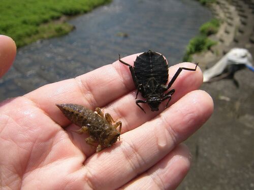 今日は観察会。暑い。 オニヤンマ科のオニヤンマ(左)とサナエトンボ科のコオニヤンマ(右)。観察会ではよくみかけるのと両方とも福岡県版水質評価法の指標種なので毎回説明がややこしい。ヤンマって名前だけどヤンマではなくサナエトンボ科です。みたいな…