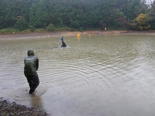 今日は雨の中ため池へ。某希少水生昆虫が多産する池にコイが出現したということで水位を落としての駆除作業です。 今回は刺し網を地引き網のように使っての採集。 三回引いて14匹採れました。事前の予測より多く、おそらくこれで9割方採れたのではないかと。…