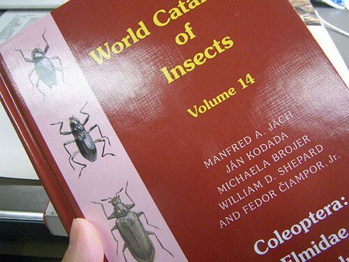 注文していた本が届きました。世界のヒメドロムシ科&Protelmidae科カタログです。 中身はひたすら学名と記載された論文と模式産地と分布の一覧。文字ばかり。300ページほどで1.5万円ほど。まさに上級者向け! イラストが1枚だけありました。脚の長いあれで…