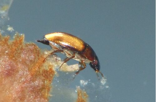オキナワミジンダルマガムシLimnebius nakanei okinawaensisです。体長約1.2ミリ。沖縄本島の固有亜種で、清流の岸際の砂利中でひっそりと暮らしています。真横からみると体下面に空気をいっぱい貯めていることがわかります。水中の砂利や落ち葉の表面を素早…