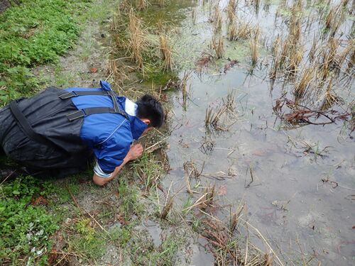 新年度です。それとは関係なく昨日は湿地帯に行きました。 近年、色々と湿地帯生物の採集や調査をしているKAMEI君に、とある巻貝の生息地を案内してもらいました。KAMEI君は巻貝にも詳しいのです。見るからに良好な湿地帯(休耕田)! ということでこれが目…
