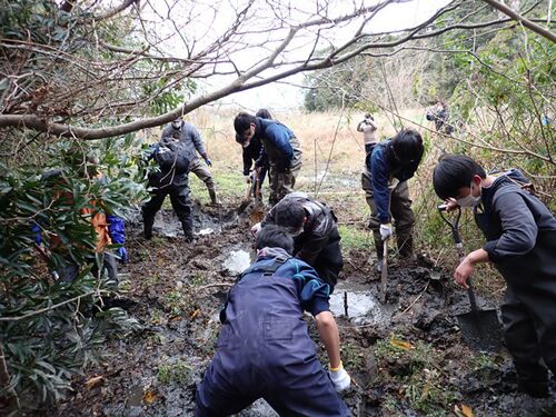 寒いです。今日は自宅回りは雪が降っていました。こんな寒い日には何をするか?湿地帯の保全・再生活動です。 今日の会場は海近くでまったく雪は積もっていませんでしたので、予定通りに湿地帯に穴を掘る作業を行いました。 みんなで掘っていきます。 こっち…