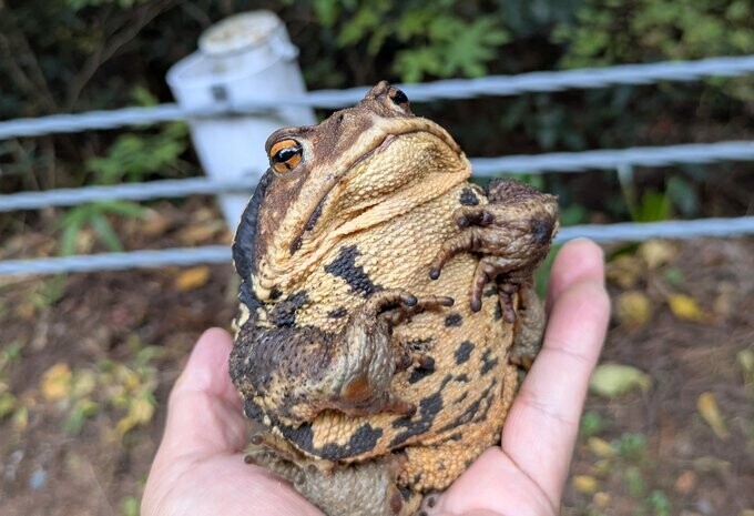 湿地帯に向かっていたところ、舗装道路上をゆっくり歩いているニホンヒキガエルがいたので、道の脇に移動させました。人間がつくった舗装道路上で人間がつくった自動車にひかれそうという場合は人間が助けても良いと思っています。でもストレスを与えてしまったかもしれない。なんか縮んでしまいました。ごめんなさい。無事に越冬してください。